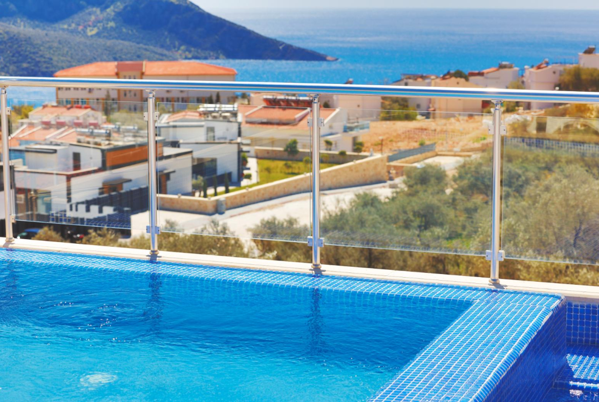 Outdoors, there is a wrap‑around terrace, while the private rooftop plunge pool and sun terrace offer uninterrupted panoramas over Kalkan Bay and the surrounding olive groves.